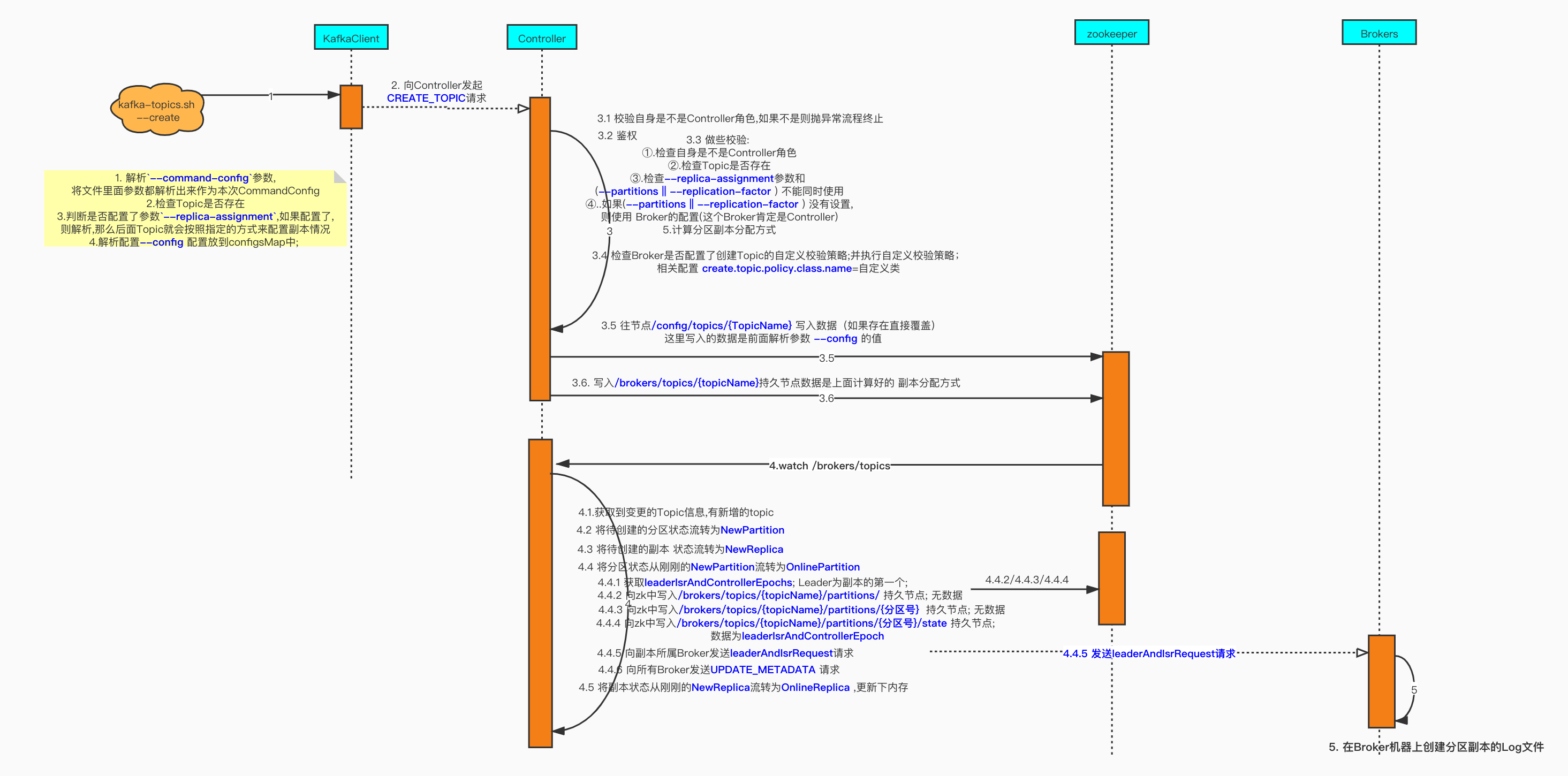先说结论: 根据上面分析过的源码画出的时序图可以指定; 客户端发起创建Topic的请求,本质上是去zk里面写两个数据